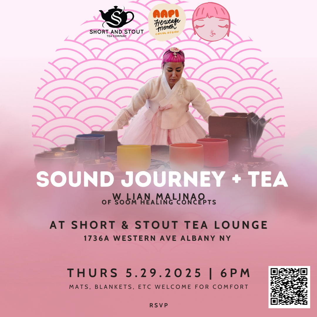 Celebrate AAPI Heritage Month with Tea & Sound Healing! Join Lian Malinao from SOOM Healing Concepts at Short and Stout Tea Lounge for a heart centered sound bath meditation and tea experience. Sound healing (supported by the vibrational frequencies of crystal and Himalayan singing bowls, tuning forks, drum, rattles, and bells) is an ancient Asian subtle body healing practice which activates vagal toning and parasympathetic activation of the nervous system promoting relaxation and wellbeing. Lian's sound journeys are fusion of Korean chanting and instruments to provide a pathway of release and self connection. Sessions are accessible to people of all backgrounds! Space is limited. Cost: $40/person.